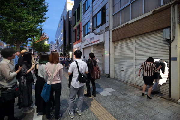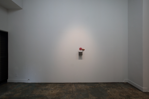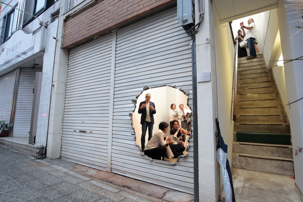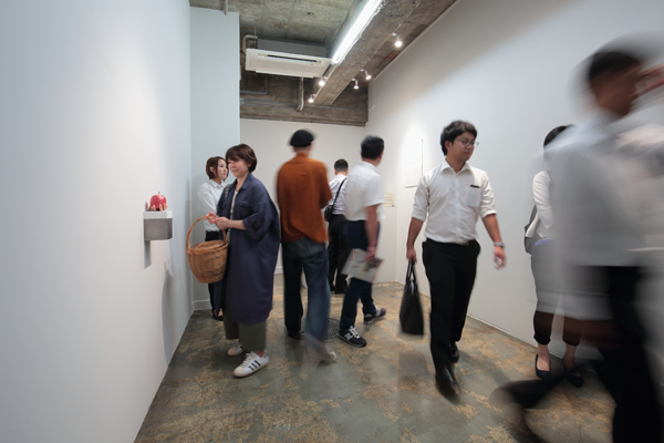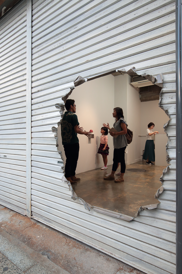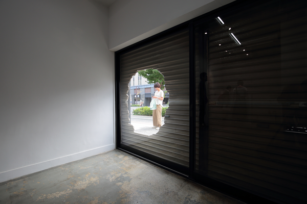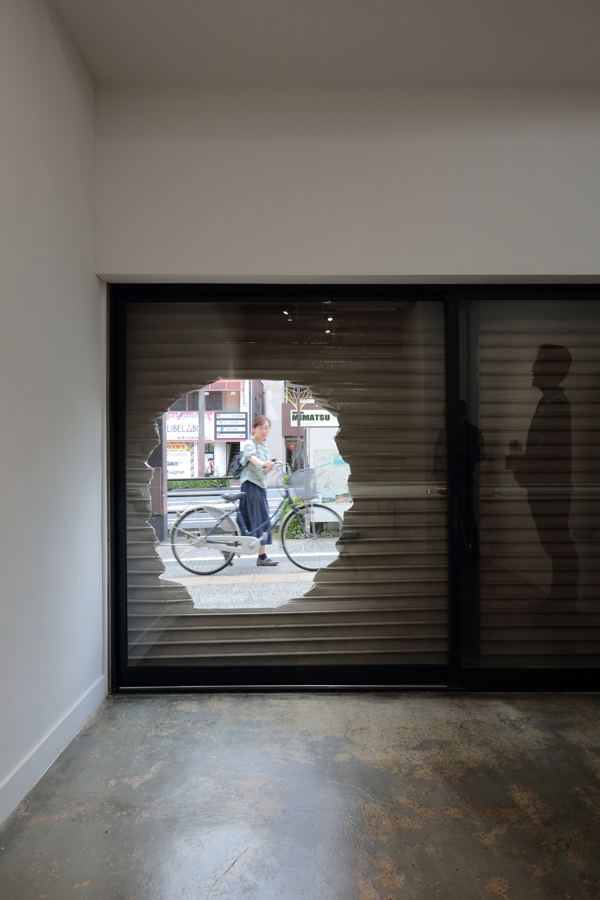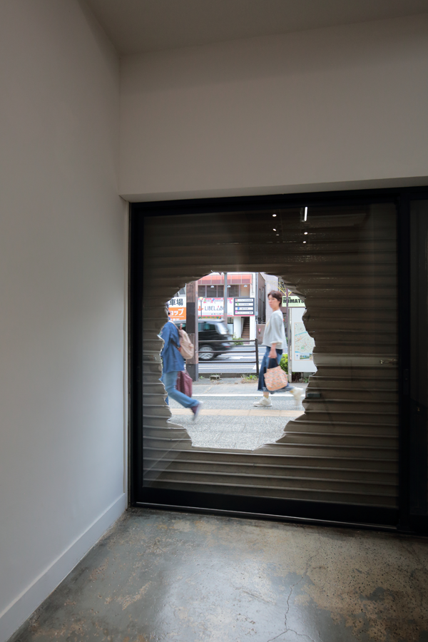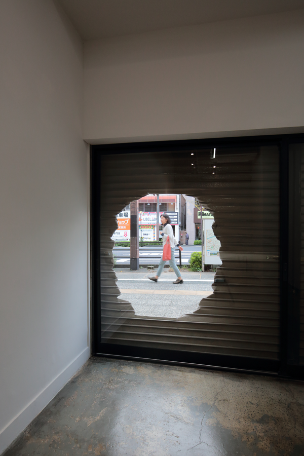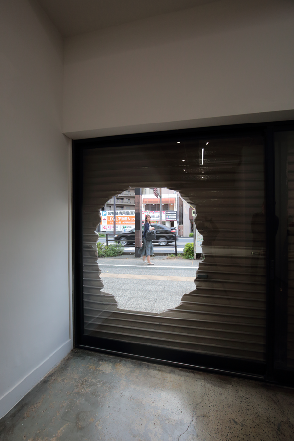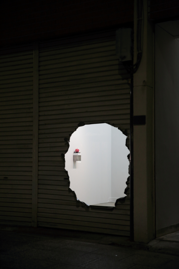 The premiere of the exhibition in a gallery that opened in an abandoned building in front of Mito station, approximately 100 km north of Tokyo. Amemiya designed the facade/artwork in which he opened a hole to an old shutter, as well as its floor, and interior walls of the venue. This project became an exhibition and a renovation project of the site, featuring the artwork Apple and Hand, which was a sculpture and an actual hand. The gallery room had a lasting impression with a limited number of works, while it also became a site-specific exhibition, featuring a backyard with works that were not shown in the gallery, as well as the backside of the shutter.