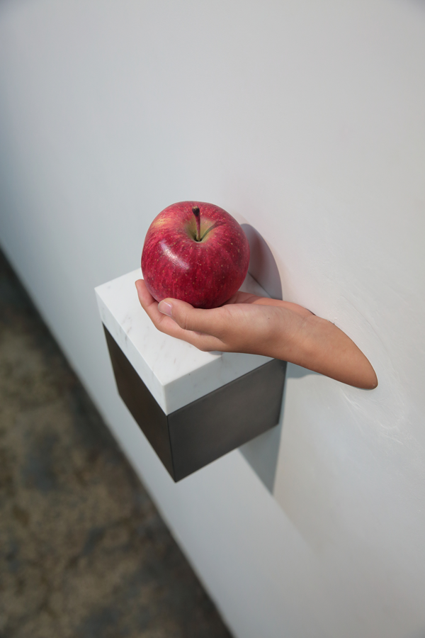 hand, marble, stainless steel, oil paint on wood